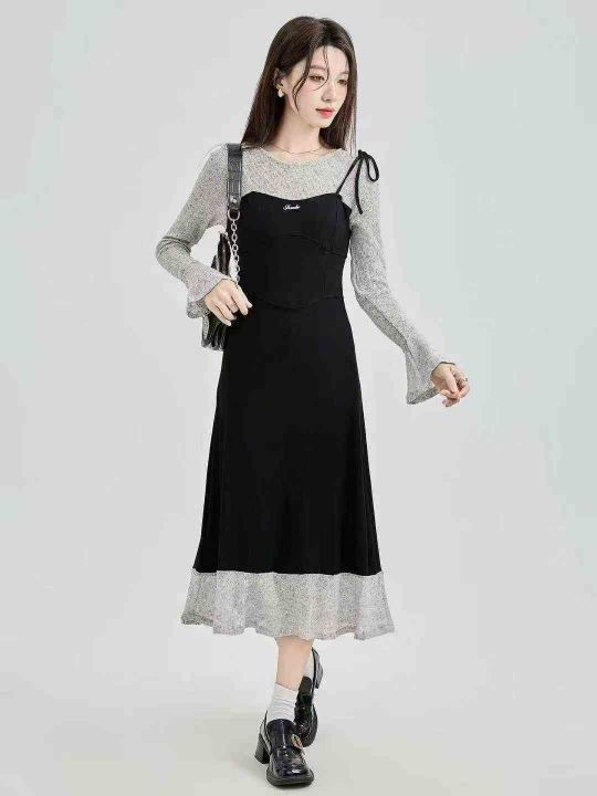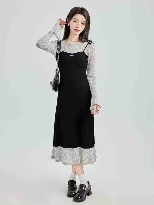 法式气质黑色连衣裙女秋冬季新款韩系假两件针织拼接长...