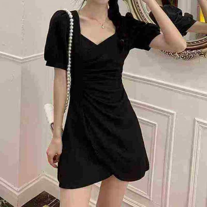 夏季新款不规则法式方领褶皱连衣裙清纯女装甜美气质中长款连衣裙 独立包装 ...