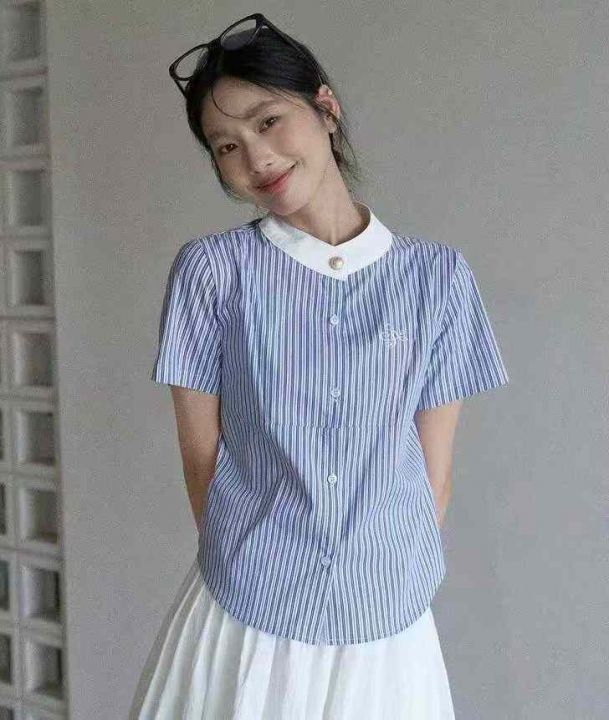 蓝色条纹短袖衬衫164件7.9,撞色拼接,后领包边,图案...