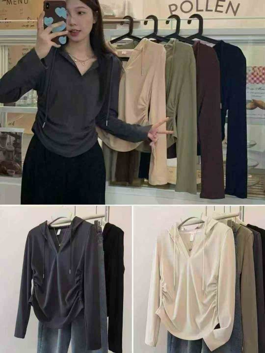 连帽卫衣修身显瘦正肩T恤小众气质长袖收腰上衣,独立包装,码数M-3XL,数量352件,分货加1,货号125#58