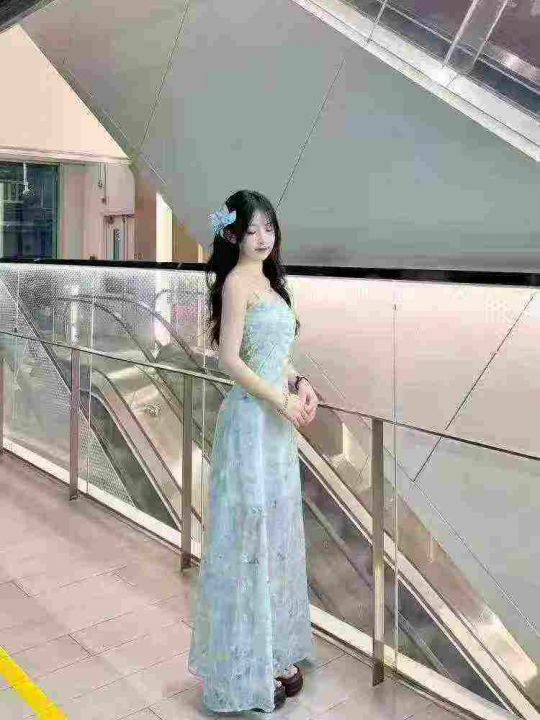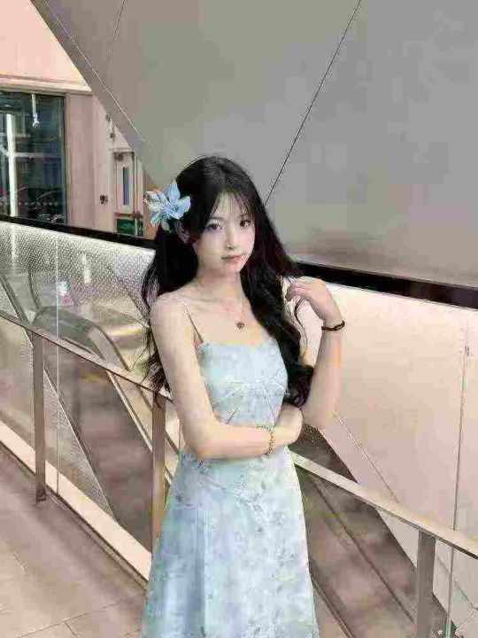 法式绝美蓝色碎花吊带连衣裙女夏季后背绑带收腰气质长裙礼服 独立包装 码数1-5码 数量370件 全清9.9
