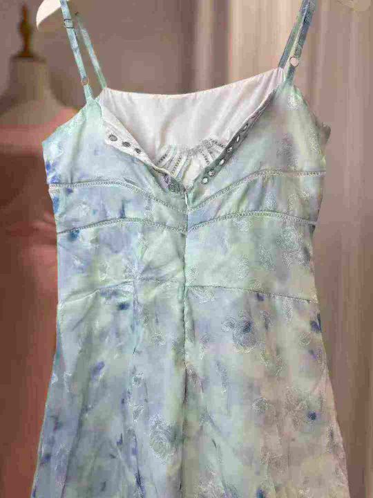 法式绝美蓝色碎花吊带连衣裙女夏季后背绑带收腰气质长裙礼服 独立包装 码数1-5码 数量370件 全清9.9