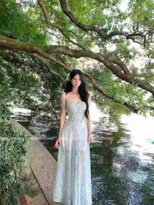 法式绝美蓝色碎花吊带连衣裙女夏季后背绑带收腰气质长...