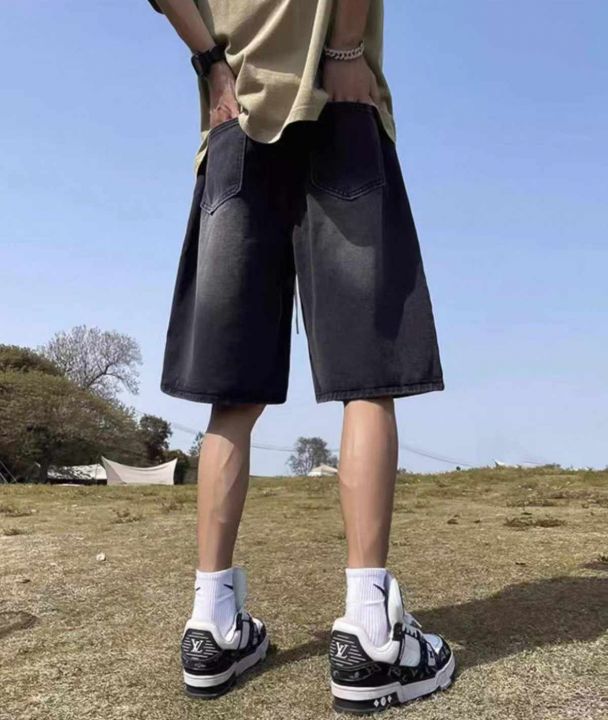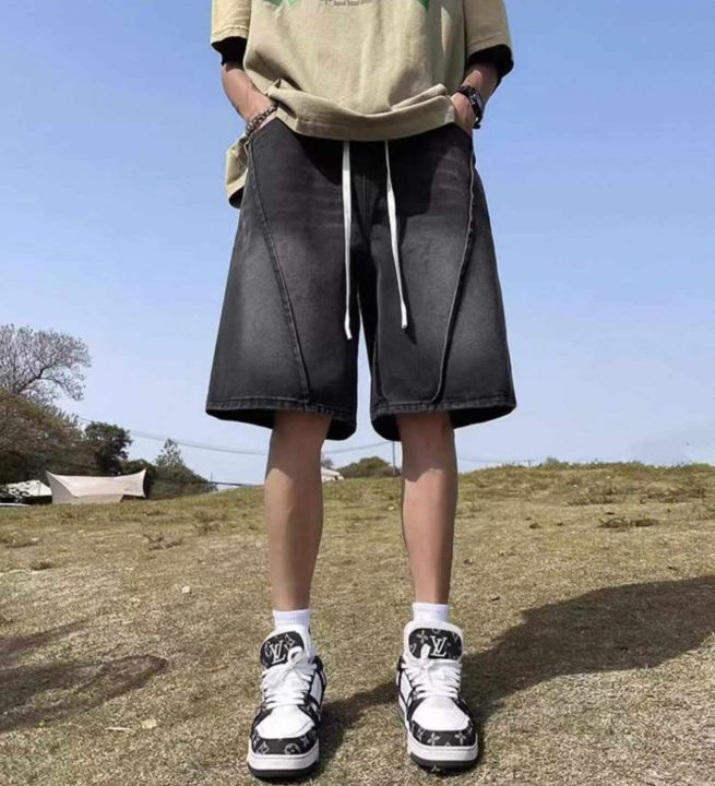 夏季新款高品质男士洗水棉松紧腰宽松阔腿牛仔短裤,独...