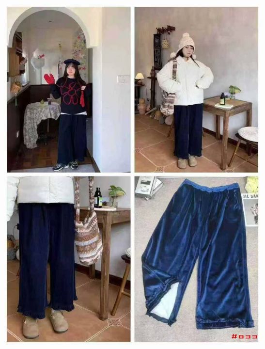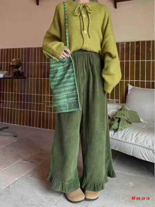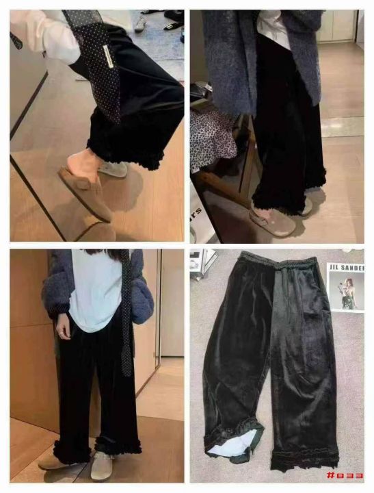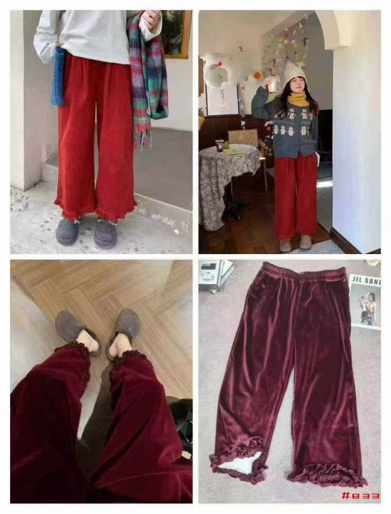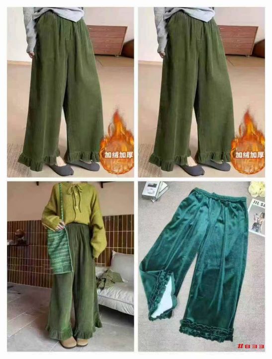 [福]日系宽松慵懒黄金绒阔腿文艺木耳边休闲裤200条左...