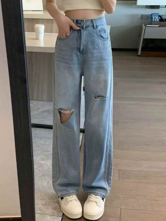 破洞薄款牛仔裤女高腰宽松显瘦直筒阔腿裤潮50条全清11.8元,码数S到XL,正...