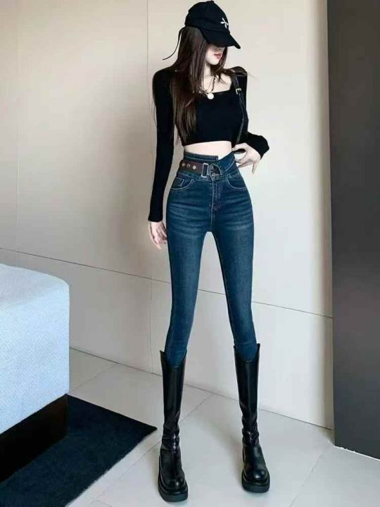 高腰牛仔裤女新款设计感腰带紧身显瘦百搭小脚铅笔裤40条全清9.8元 ,码数SM...