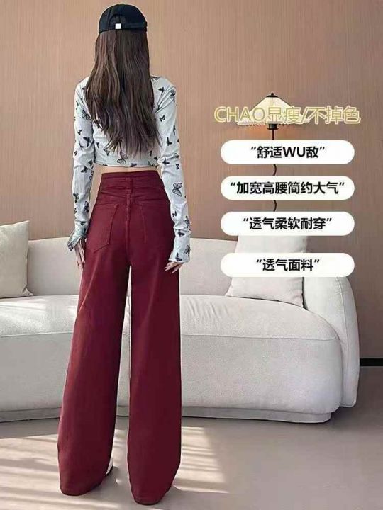 安可拉红阔腿牛仔裤女新款高腰宽松显瘦垂感直筒酒红色152条全清11.8元,码...