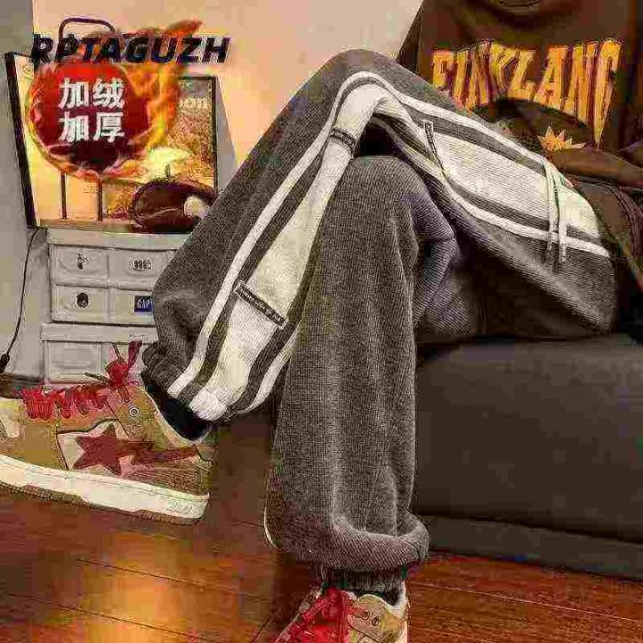 侧边条纹灯芯绒男冬季加绒加厚潮牌宽松束脚裤子,整款...