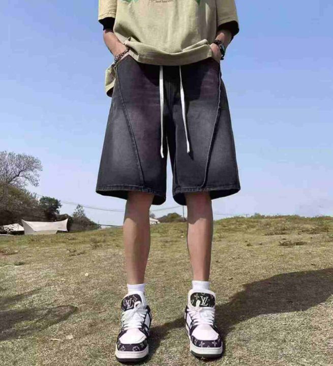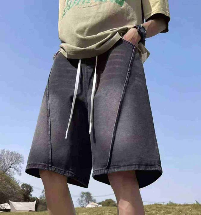 夏季新款高品质男士洗水棉松紧腰宽松阔腿牛仔短裤,独...