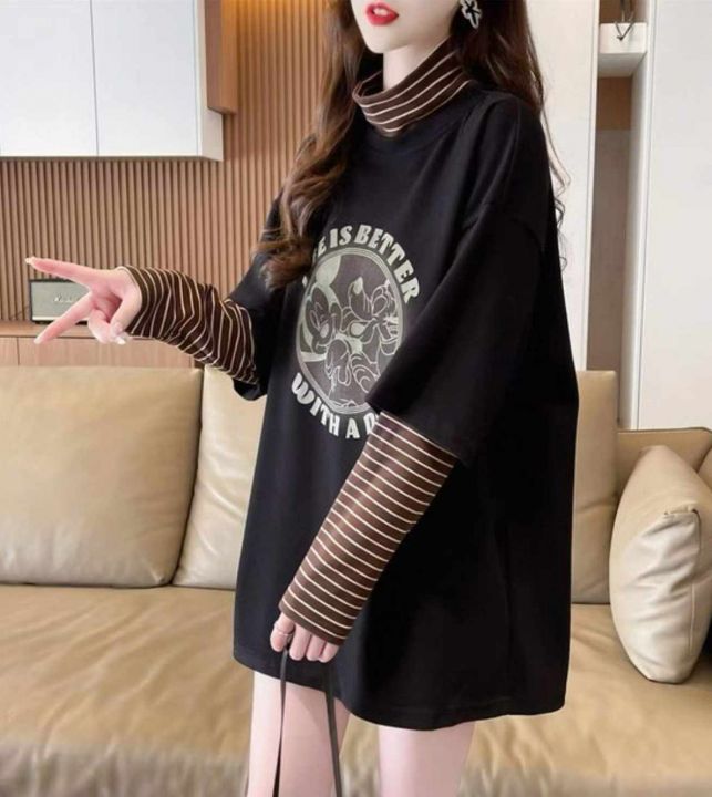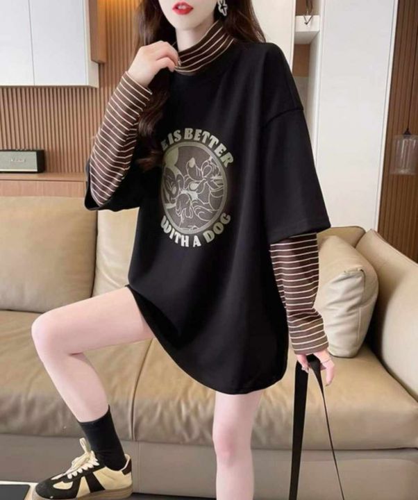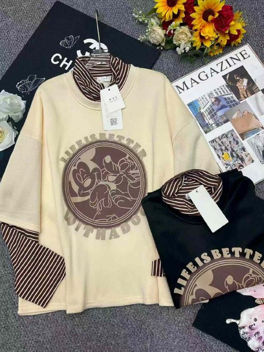 冬季新款加绒大码假两件长袖拼接慵懒风韩版宽松百搭加绒印花打底上衣,独立包装,码数L--4XL码,100件左右,全清4.9元超低价秒杀!