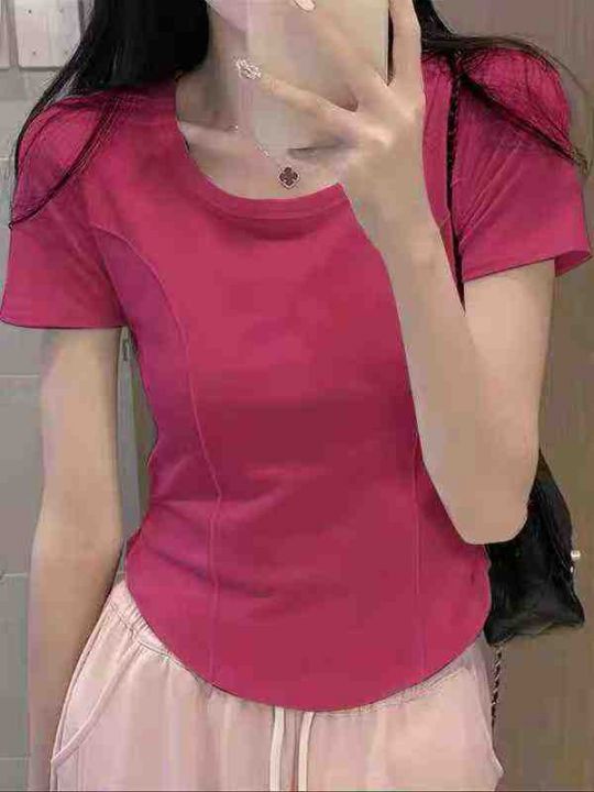 ☕️纯棉辣妹T火龙果色正肩短袖t恤女夏季欧货收腰显瘦短款不规则鱼骨打底上...