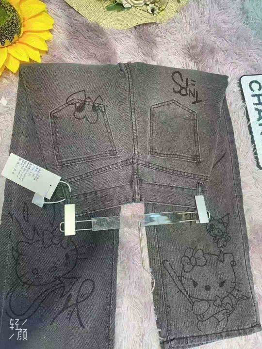 黑色TK猫卡通涂鸦牛仔裤胖阔腿拖地裤子,码数XS-XL,独立包装货品干净,140条全清16.8
