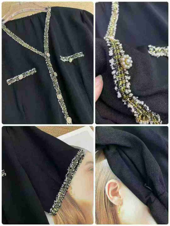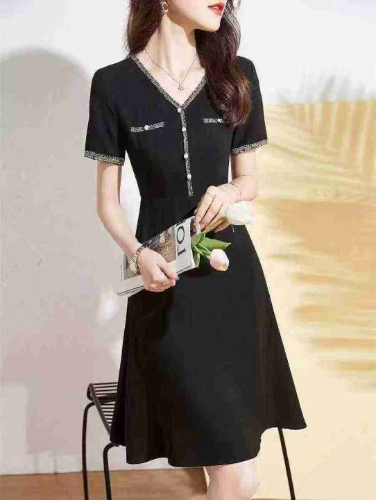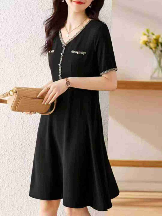 法式小香风连衣裙645件9.9,拼接V领,A字裙摆,侧腰拉...