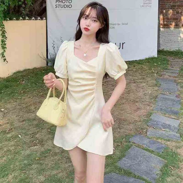 夏季新款不规则法式方领褶皱连衣裙清纯女装甜美气质中...