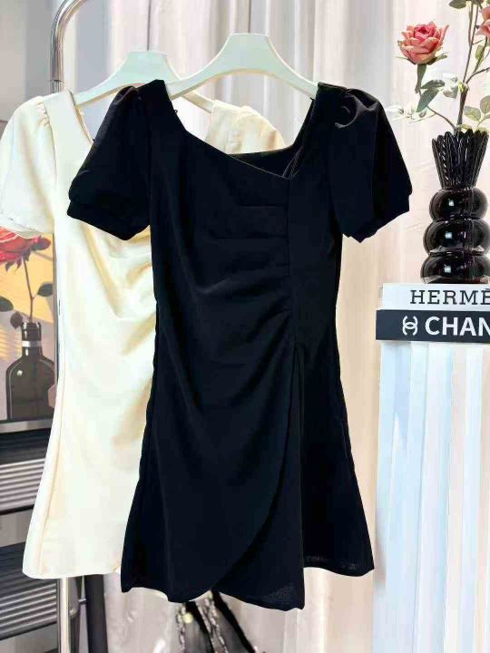 夏季新款不规则法式方领褶皱连衣裙清纯女装甜美气质中长款连衣裙 独立包装 码数1-4码 数量70件 全清6.9