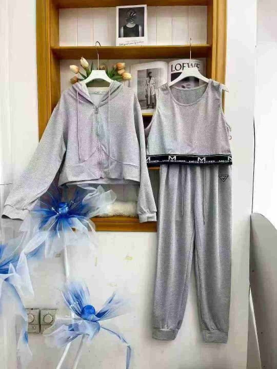 ① 时尚休闲女款开衫连帽三件套装!版型宽松,款式漂亮,独立包装,码数XL-3XL,数量130套左右,全清13.8元
