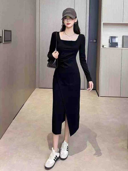☕️法式黑色方领开叉长袖连衣裙女秋季新款收腰显瘦长...