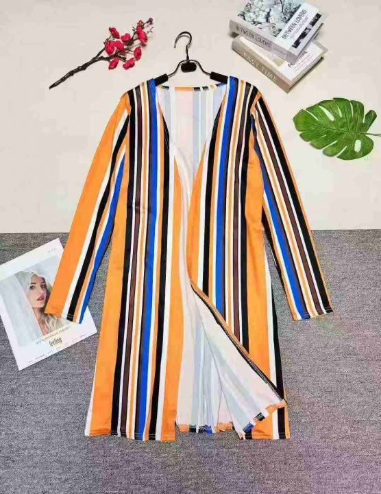 欧美女装时尚印花条纹长外套,数量:285件,码数:S-2XL,整款三色,品质好,有独立包装。