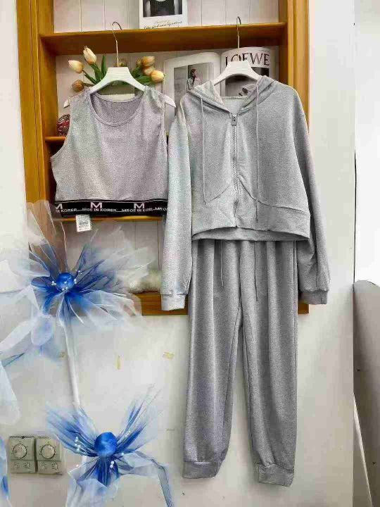 ① 时尚休闲女款开衫连帽三件套装!版型宽松,款式漂亮,独立包装,码数XL-3XL,数量130套左右,全清13.8元