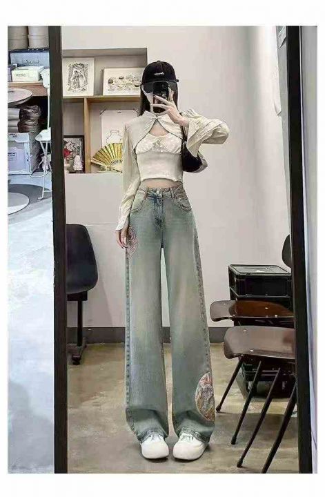 秋季新款洗水棉网红复古国风刺绣直筒阔腿牛仔长裤,独...