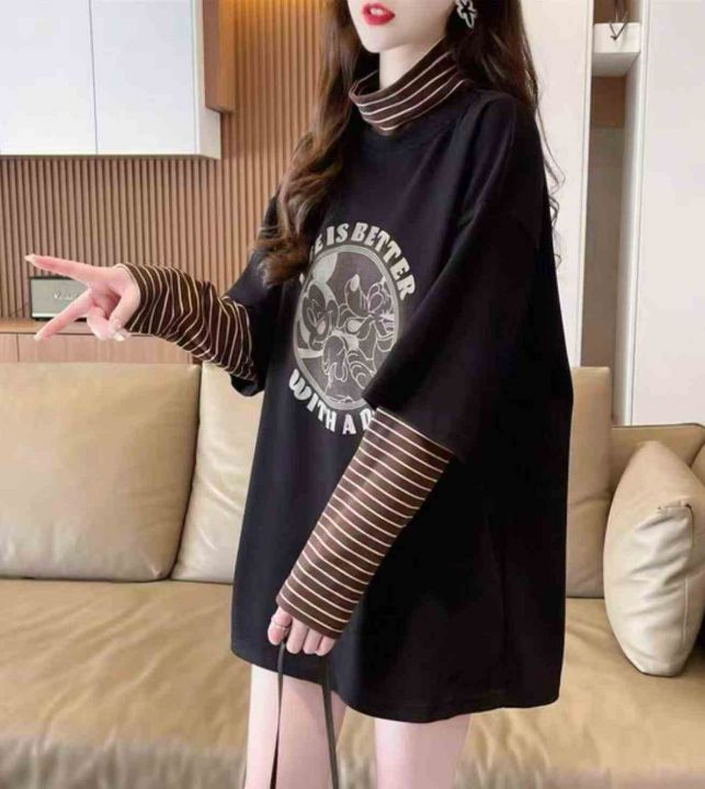 冬季新款加绒大码假两件长袖拼接慵懒风韩版宽松百搭加...
