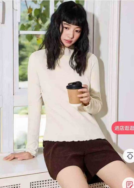 木耳边半高领打底衫女秋冬新款加绒保暖内搭外穿上衣,...