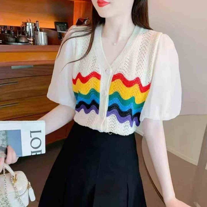 夏季新款条纹镂空冰丝雪纺拼接泡泡袖宽松针织毛衣开衫...