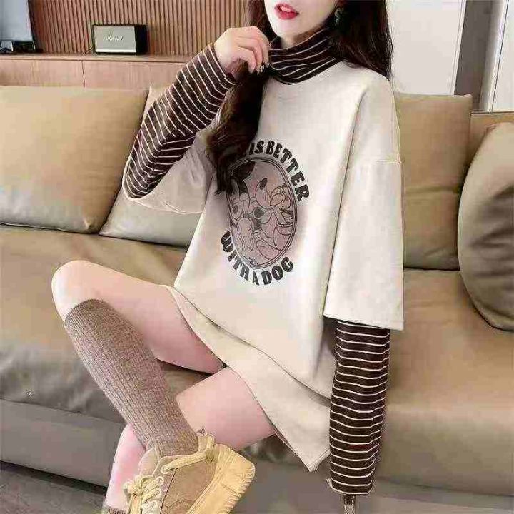 冬季新款加绒大码假两件长袖拼接慵懒风韩版宽松百搭加绒印花打底上衣,独立...