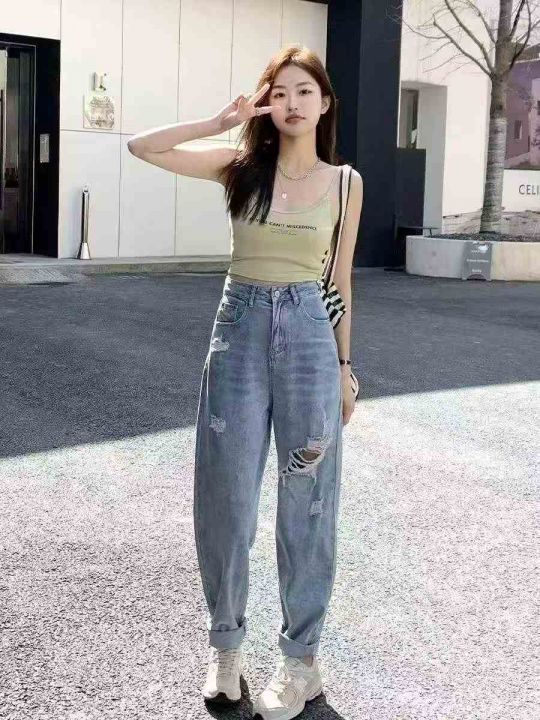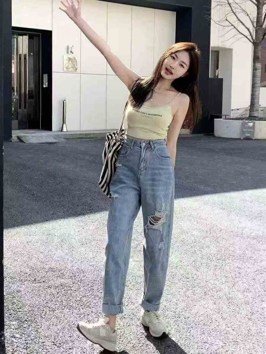 春夏季新款微胖MM破洞设计款牛仔老爹哈伦裤,独立包装...