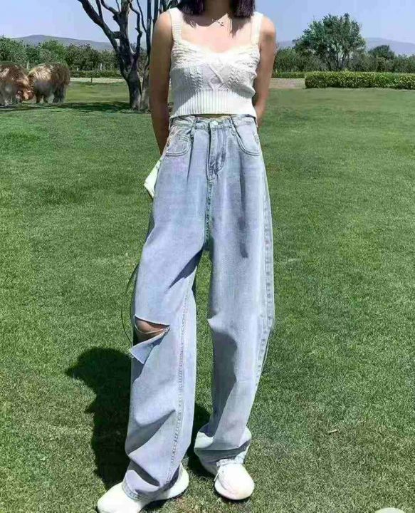 春秋新款复古网红破洞可调节直筒阔腿牛仔裤,独立包装...