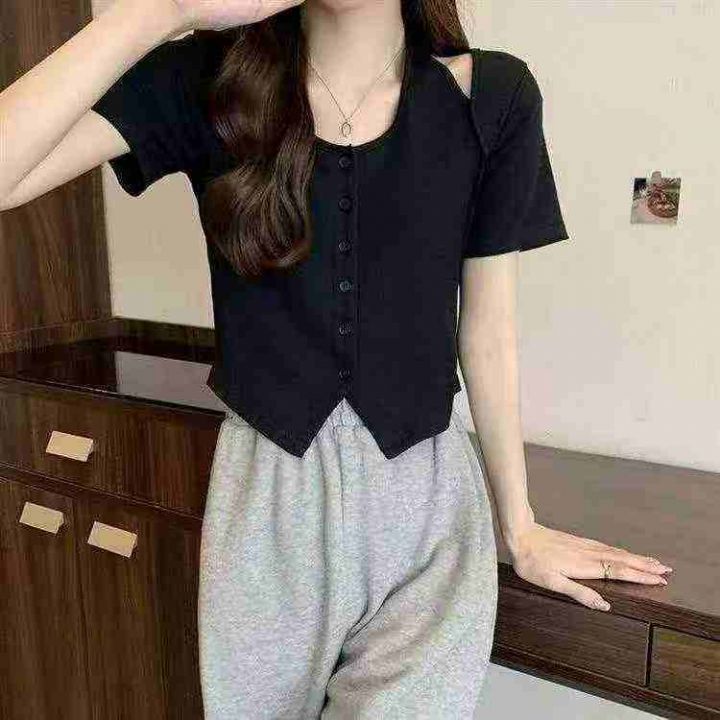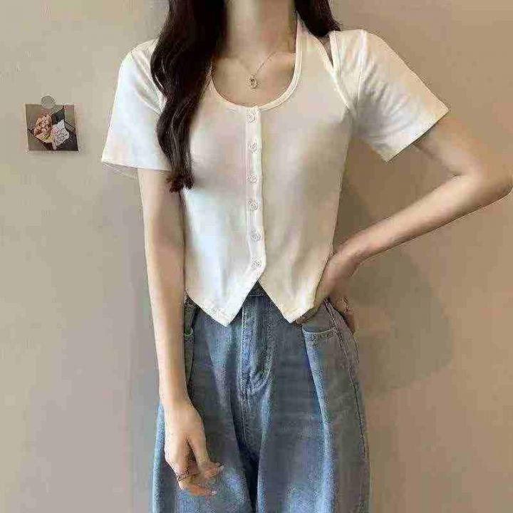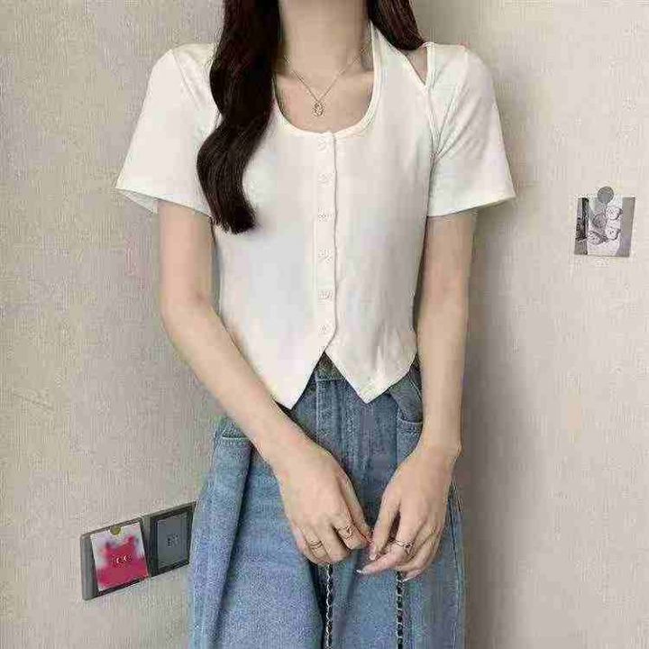 夏季新款弹力修身显瘦辣妹假两件挂脖短款针织短袖,独立包装,均码面料柔软舒适,780件,全清6.9元超低价秒杀!分货加一!白色为主!