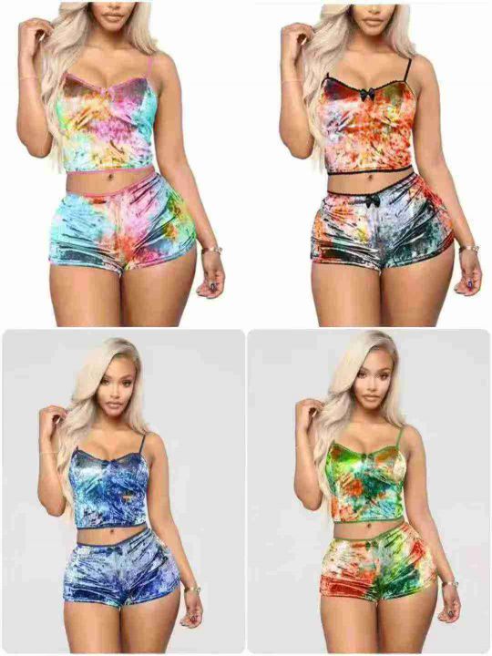 欧美时尚性感金丝绒扎染斑纹吊带短裤两件套,数量700套左右,码数S-2XL,一个款花型多色,品质好,拉链式独立包装。