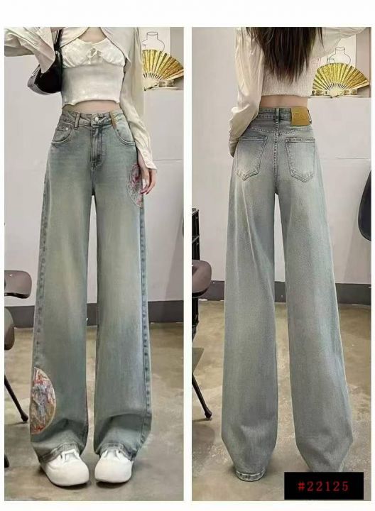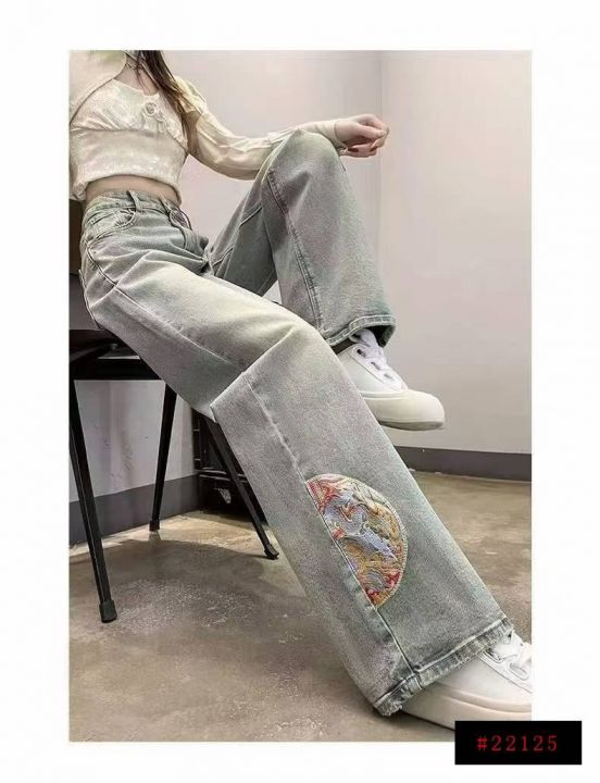 秋季新款洗水棉网红复古国风刺绣直筒阔腿牛仔长裤,独...