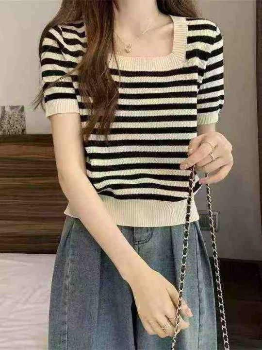 夏季新款撞色条纹修身显瘦针织短袖T桖,独立包装,均...