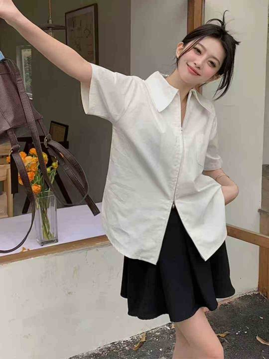 大码法式设计感双拉链POLO领长短袖衬衫女春夏薄款衬衣...