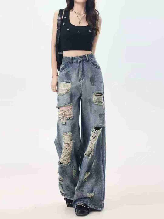 复古扎染废土风破洞女牛仔裤水洗垂感阔腿拖地裤,码数...