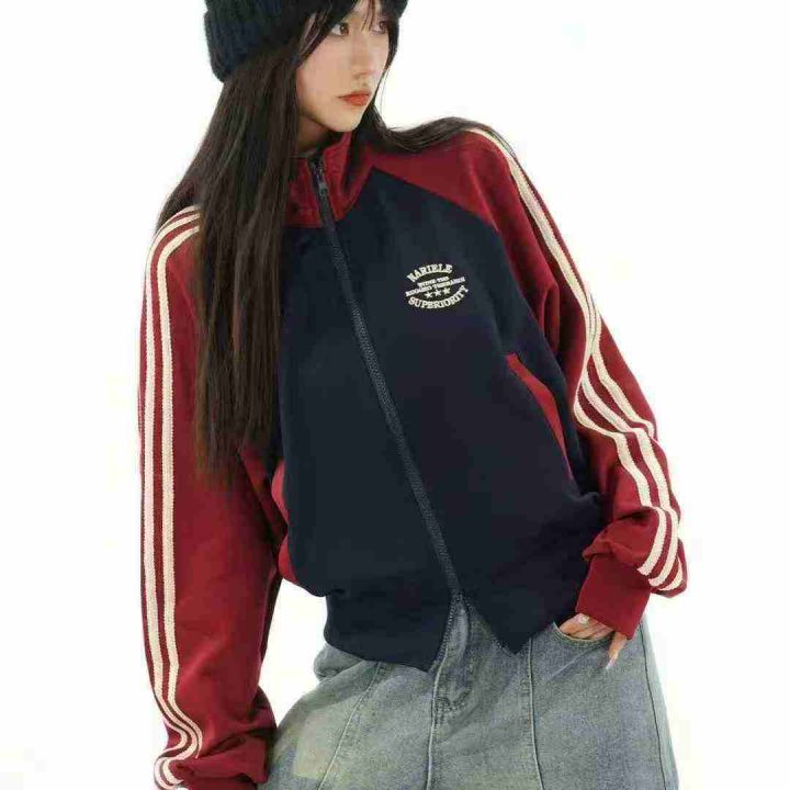 美式复古学院风辣妹春秋季短款拉链开衫女条纹拼色立领...