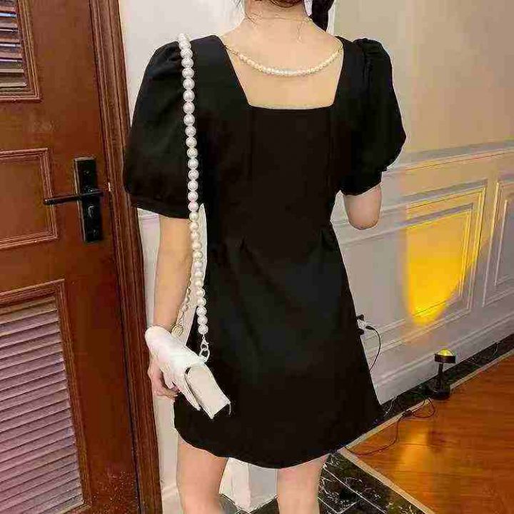 夏季新款不规则法式方领褶皱连衣裙清纯女装甜美气质中...