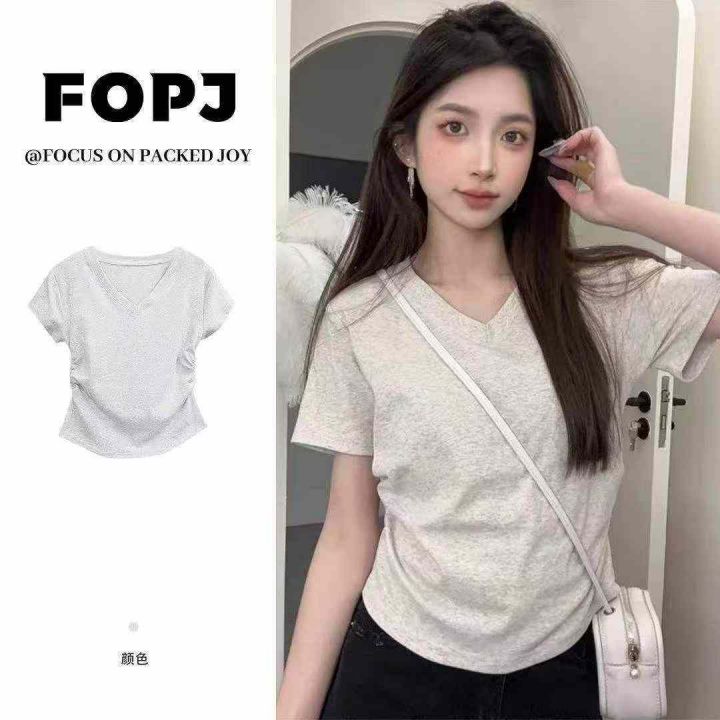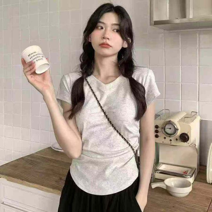 [發]60件左右纯棉褶皱V领正肩短款修身显瘦辣妹上衣独立包装 6. 8清