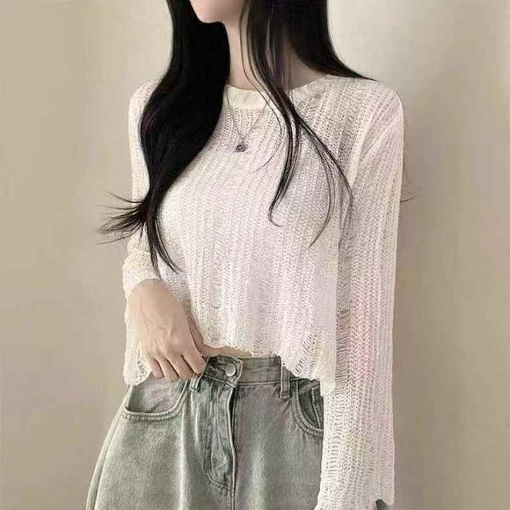 新款镂空上衣配吊带的小外搭韩版纯色宽松设计感长袖针织衫潮,整款4色,独...
