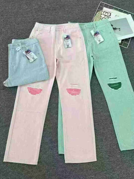 夏日马卡龙色系牛仔阔腿裤☕️1800条全清12.8 分货13.8 码数XS到XXL,有码数清单,两种长度有尺寸表,独立包装,美式复古破洞直筒牛仔裤女高街ins潮设计感小众高腰阔腿拖地裤子