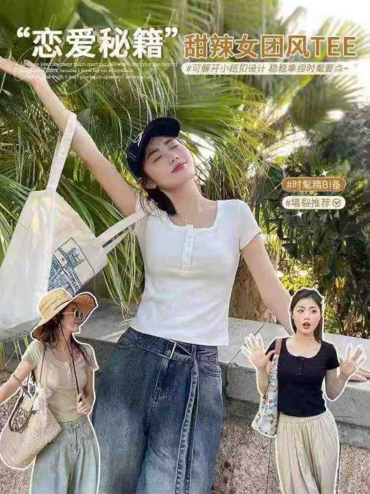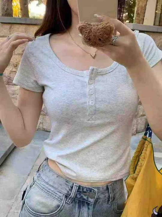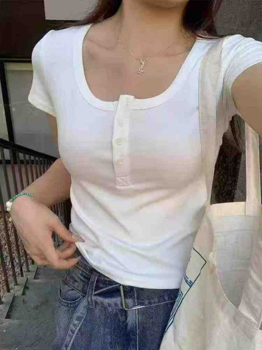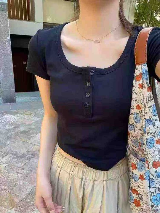 辣妹T恤☕️800件全清13.8元,分货14.8元,均码 黑色 杏色多,个别有宝蓝 深灰,纯棉高弹力,新款新货[庆祝]法式U领正肩短袖t恤女夏季设计感小众别致独特短款显瘦甜辣妹上衣