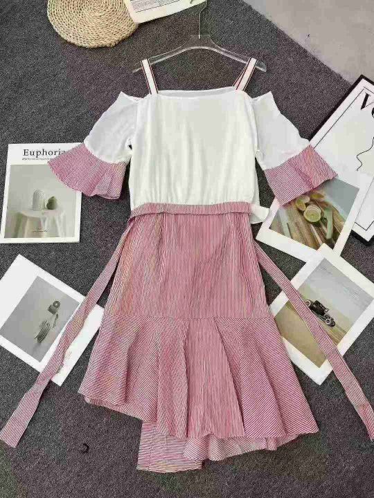 ☕️韩版小性感一字领露肩拼色吊带裙条纹短袖连衣裙337件全清10.8元分货➕1元,码数S到XXL,单款单色,独立包装[庆祝][庆祝][庆祝]