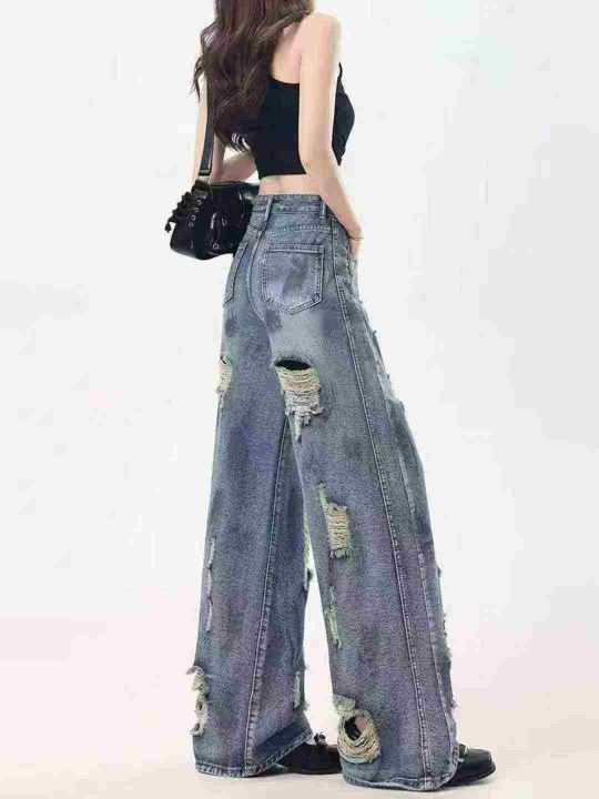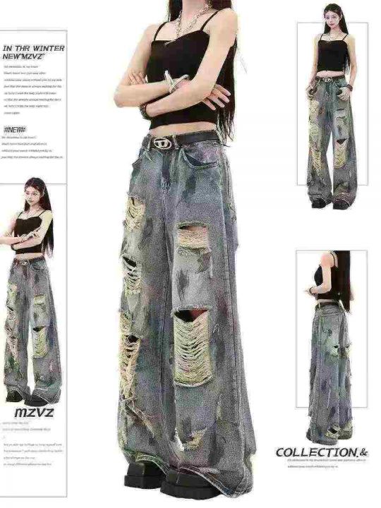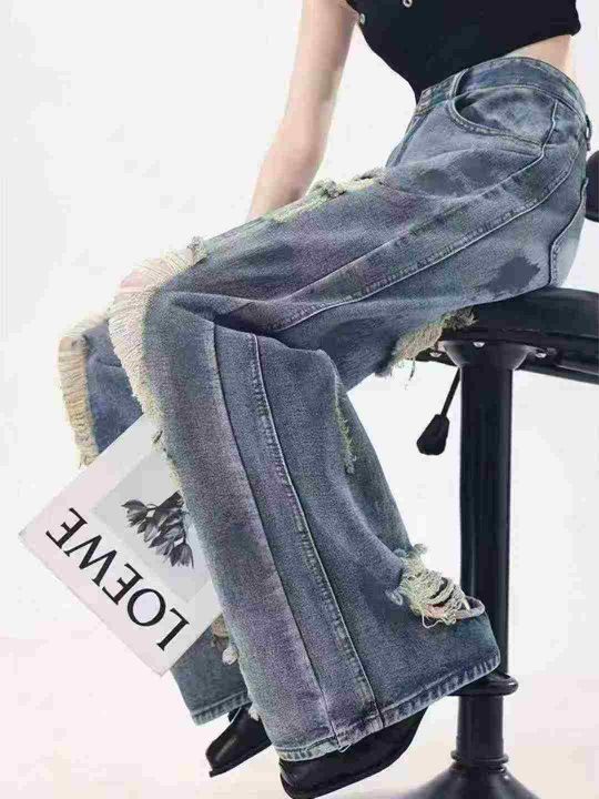 复古扎染废土风破洞女牛仔裤水洗垂感阔腿拖地裤,码数...