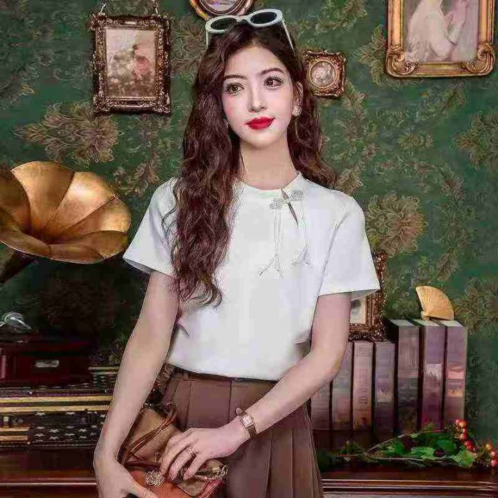 ☕️新中式短袖白色T恤女穿搭休闲百搭短款盘扣上衣200...