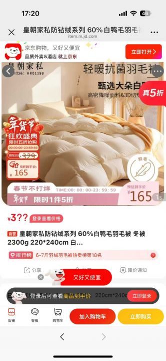 皇朝家私防钻绒系列 60%白鸭毛羽毛被 冬被 2300g 220*240cm ,200床,68元一床