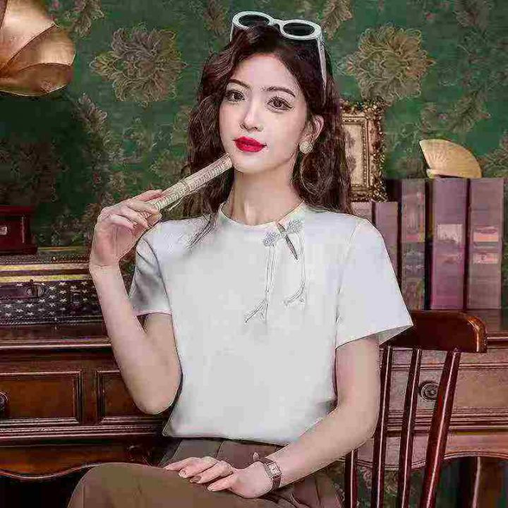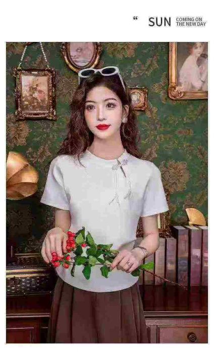☕️新中式短袖白色T恤女穿搭休闲百搭短款盘扣上衣200...