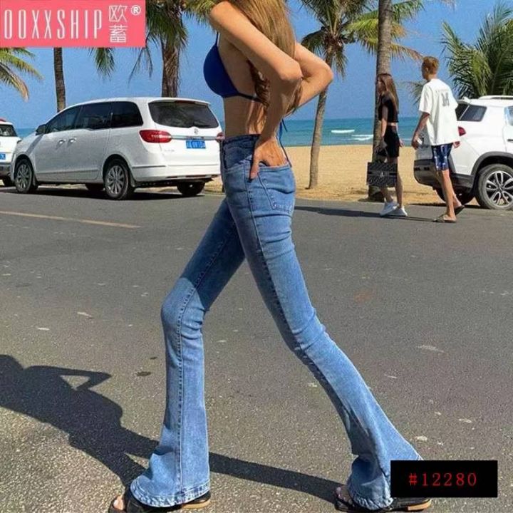 弹力蓝色马蹄女士喇叭显瘦修身拖地牛仔裤,单款单色,...