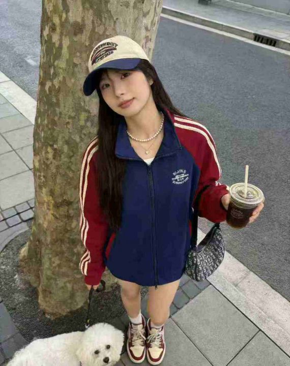 美式复古学院风辣妹春秋季短款拉链开衫女条纹拼色立领...